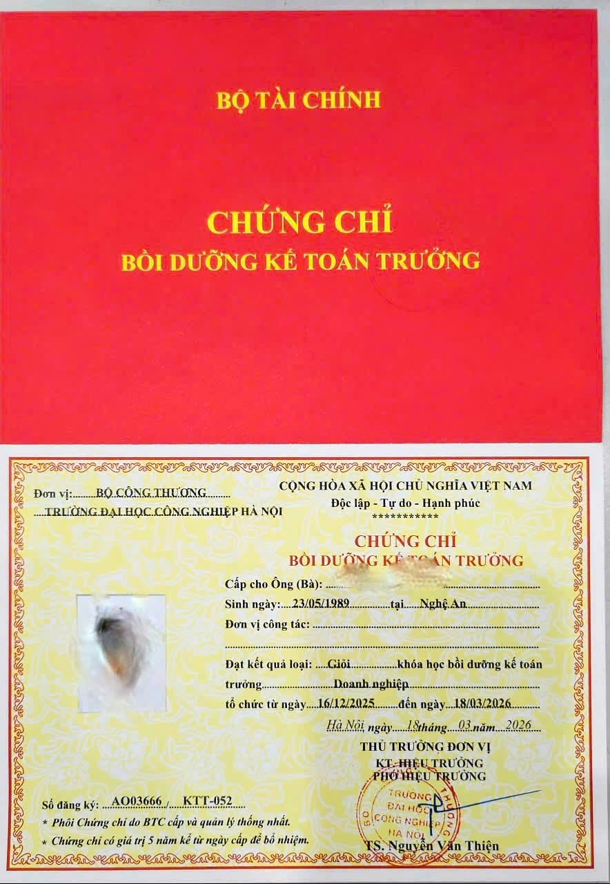 - Hoàn thành khóa học, học viên được cấp Chứng chỉ Bồi dưỡng Kế toán trưởng Doanh nghiệp do Bộ Tài chính quản lý - Trường Đại Học Công Nghiệp Hà Nội đào tạo và đóng dấu, có giá trị trên phạm vi toàn quốc.