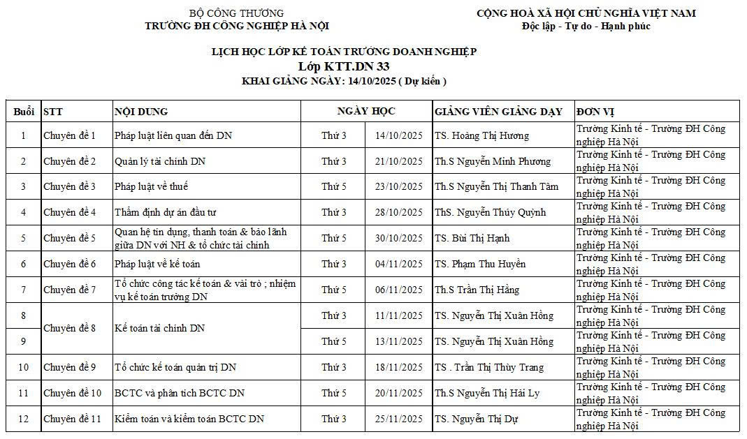 Giảng viên: Là các giáo viên của Trường Kinh tế - Đại học công nghiệp Hà Nội có thâm niên công tác, có học vị Giáo sư, Tiến Sỹ đồng thời là những người trực tiếp biên soạn tài liệu bồi dưỡng kế toán trưởng trực tiếp tham gia giảng dạy.