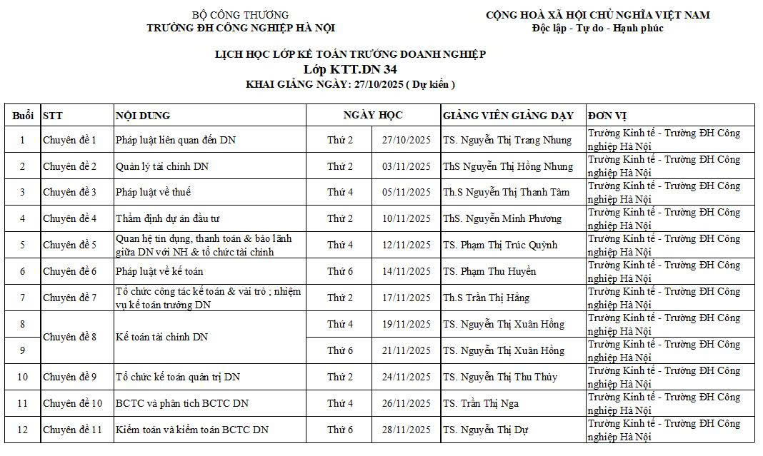 Lớp DN 34: Khai giảng vào ngày 27/10/2025. Lịch học chi tiết: Học vào tối thứ 2, thứ 4, thứ 6. Thời gian: Từ 19h - 21h30.